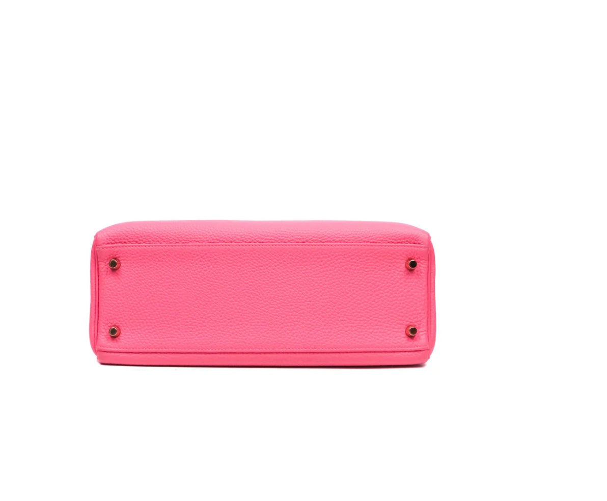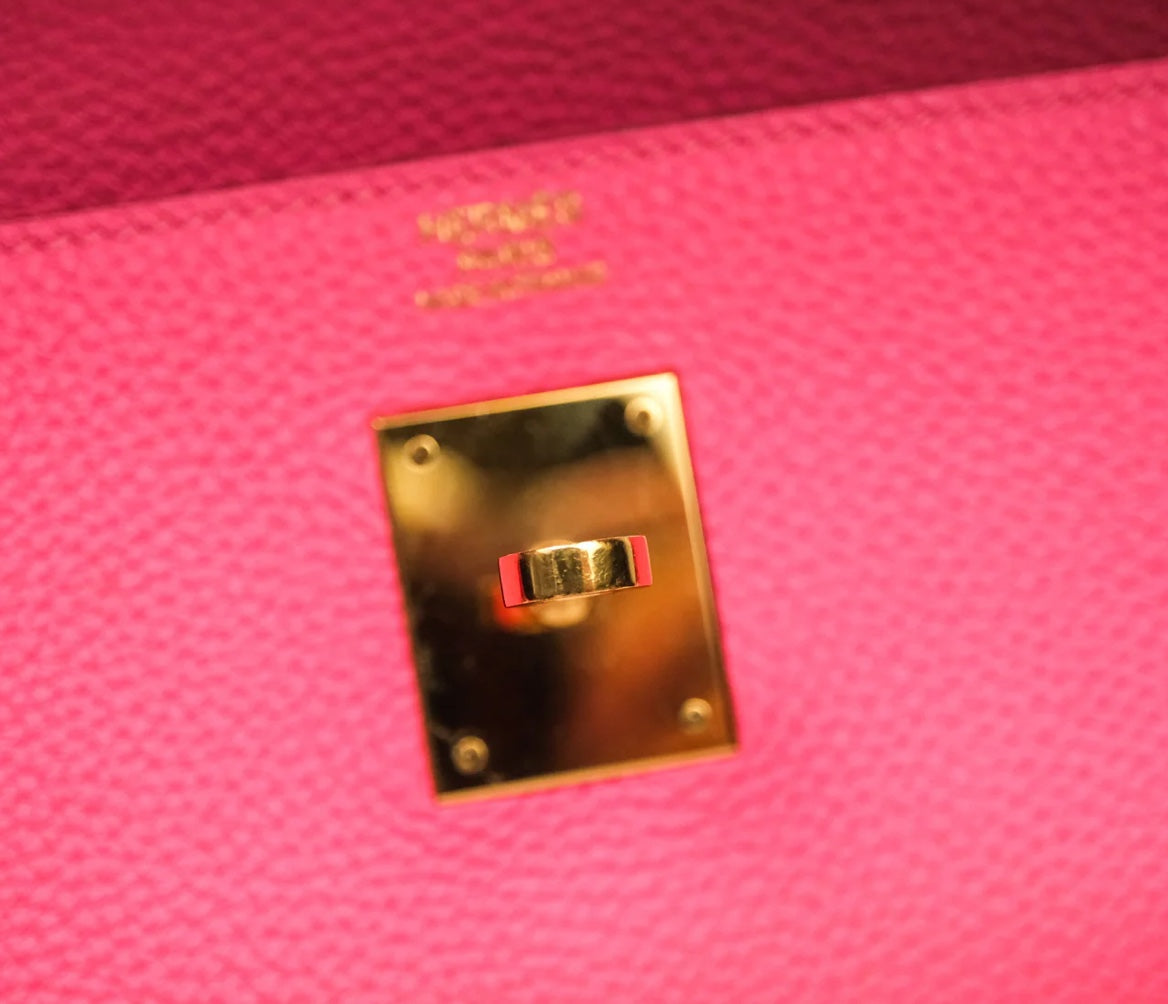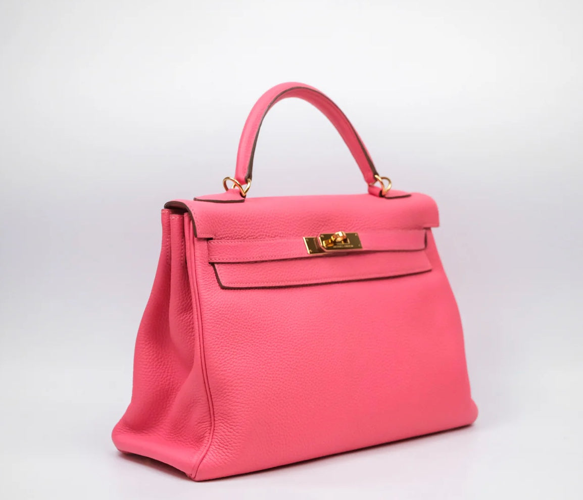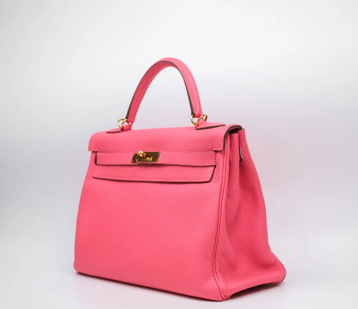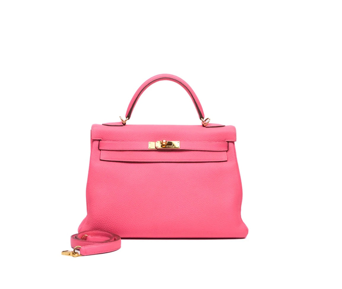 Bolso Hermès Kelly 32 Retourne en color Rose Azalée (código 8W) con herrajes dorados.