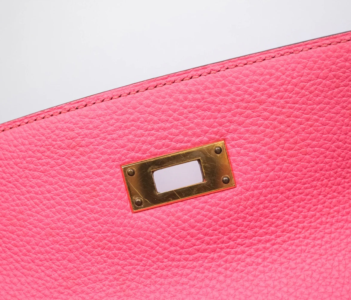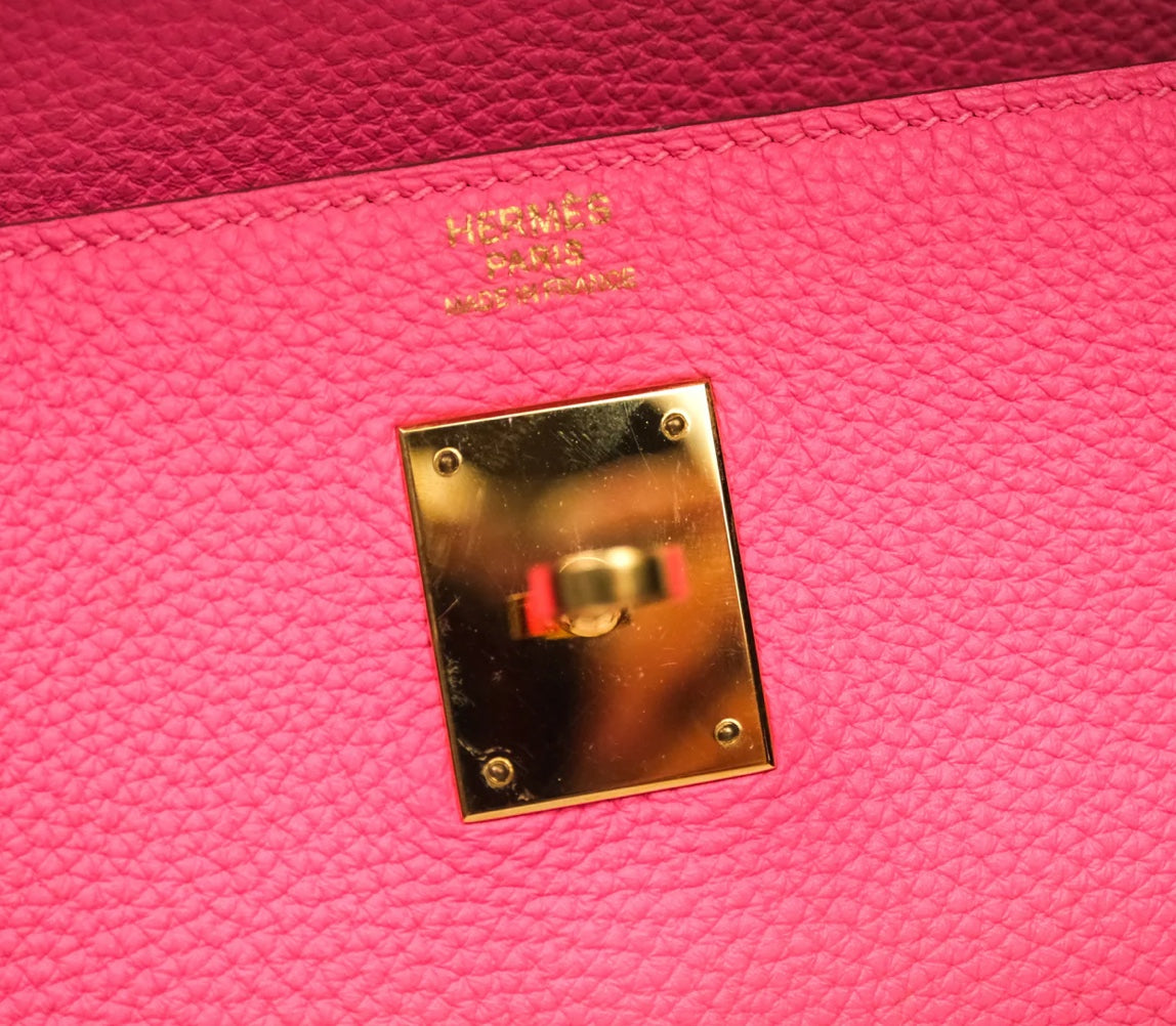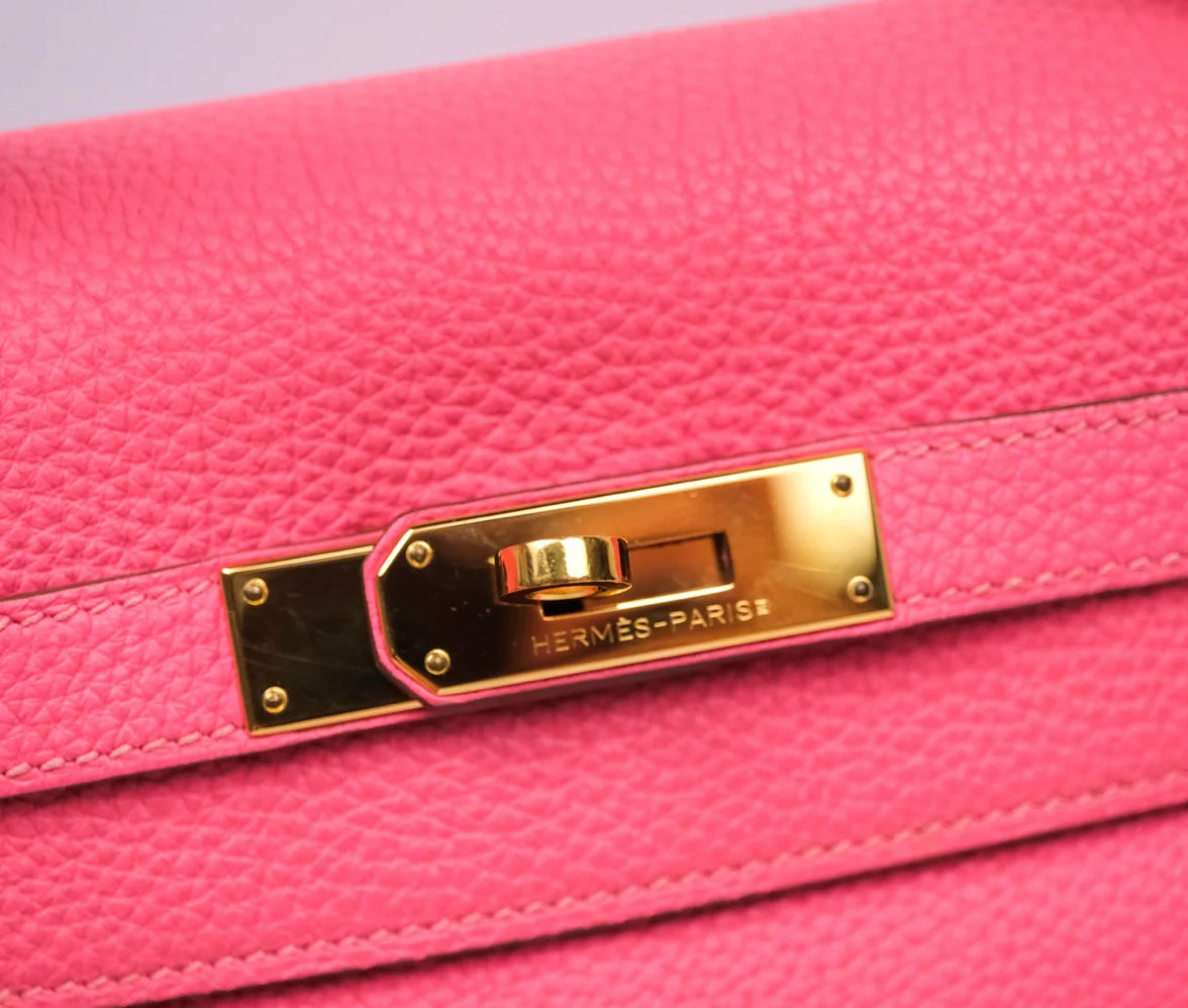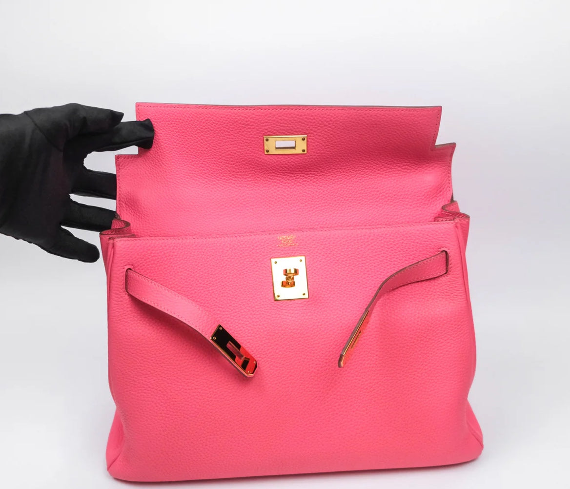 Bolso Hermès Kelly 32 Retourne en color Rose Azalée (código 8W) con herrajes dorados.