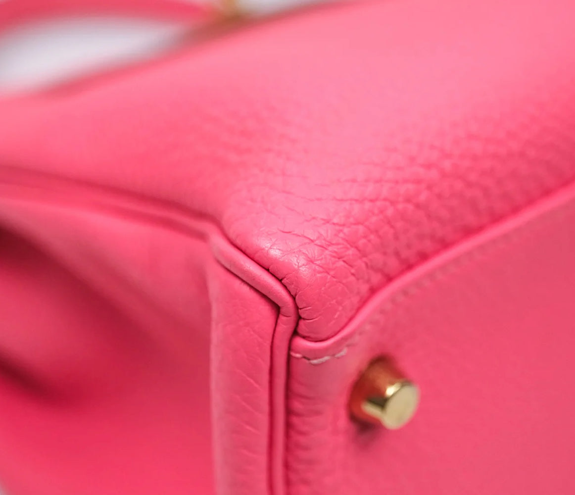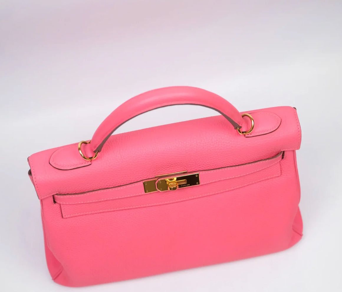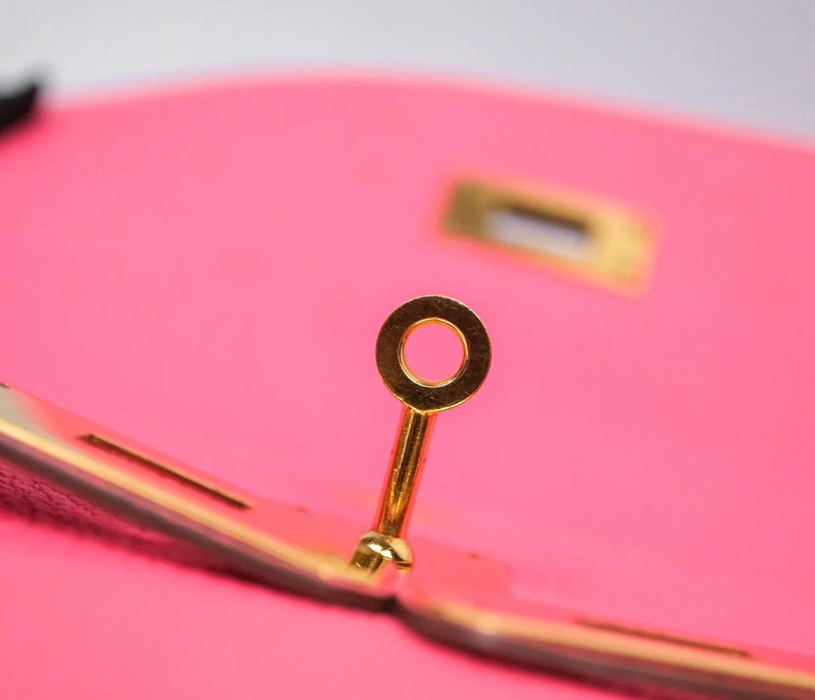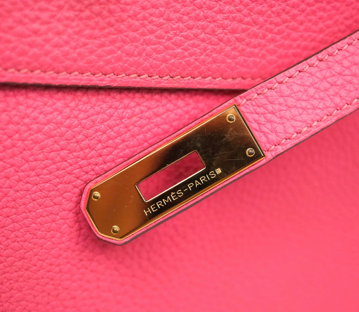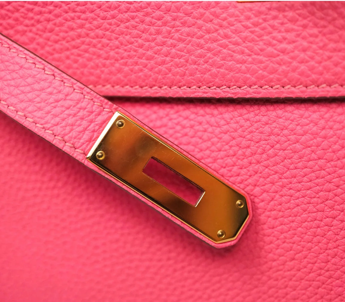 Bolso Hermès Kelly 32 Retourne en color Rose Azalée (código 8W) con herrajes dorados.