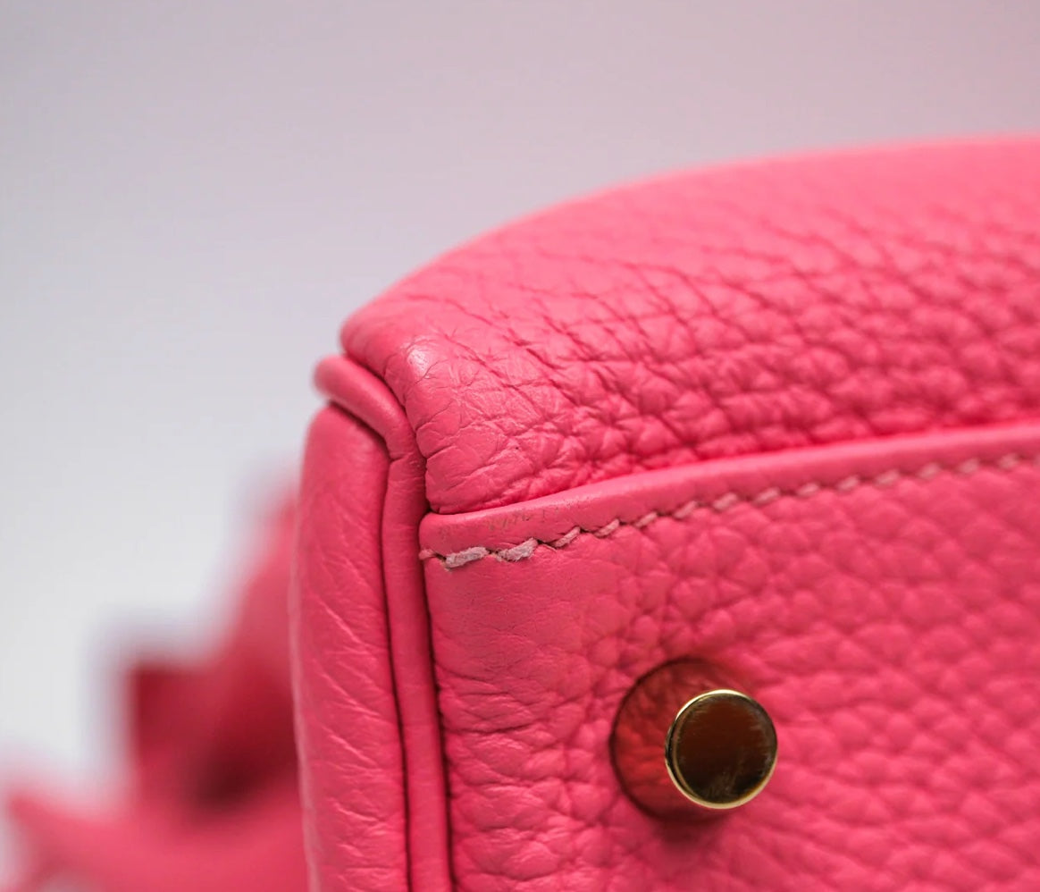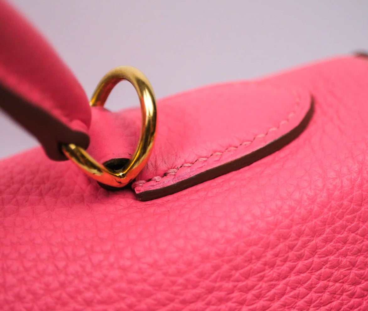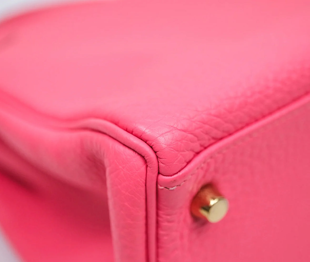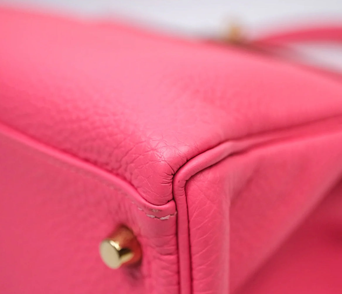 Bolso Hermès Kelly 32 Retourne en color Rose Azalée (código 8W) con herrajes dorados.