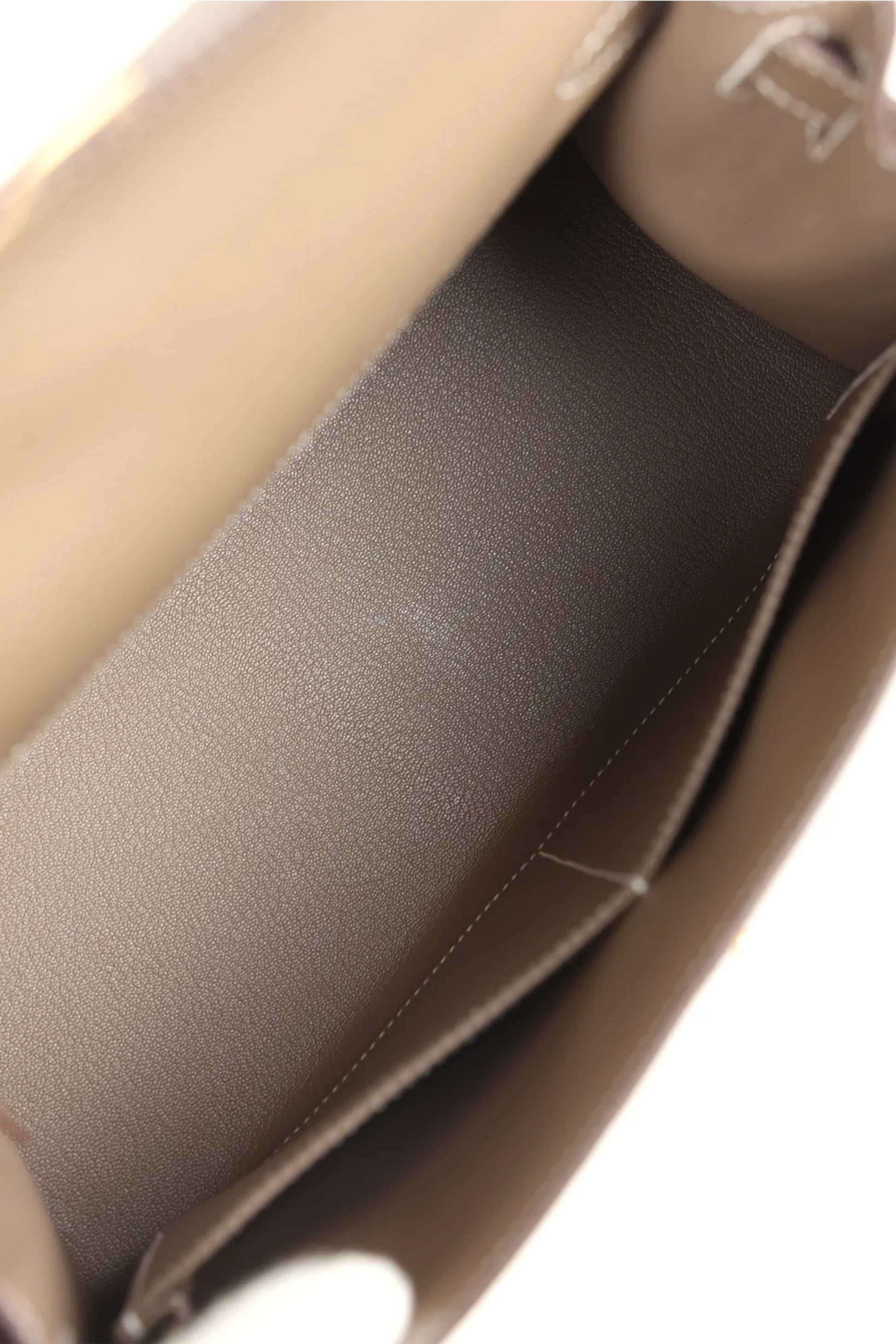 El tono Etoupe, combina la elegancia del gris topo con matices cálidos y costuras blancas contrastantes que resaltan su silueta estructurada. El acabado Sellier le otorga líneas definidas y un porte majestuoso, mientras que el cuero Epsom ofrece ligereza, durabilidad y una textura fina que mantiene la forma del bolso impecable con el tiempo.