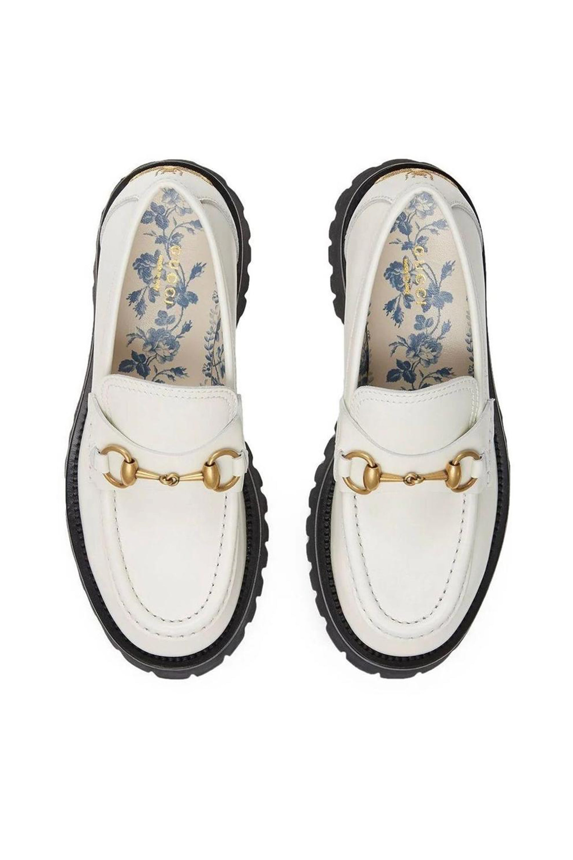 Presentando el característico detalle metálico "Horsebit" en la parte superior, un símbolo clásico de la casa italiana. Están confeccionados en cuero liso de color crema, lo que les brinda un acabado pulido y sofisticado. La suela gruesa de goma con textura dentada no solo añade un toque moderno y audaz al diseño, sino que también mejora la tracción y el confort, adaptándose perfectamente tanto a atuendos formales como casuales.