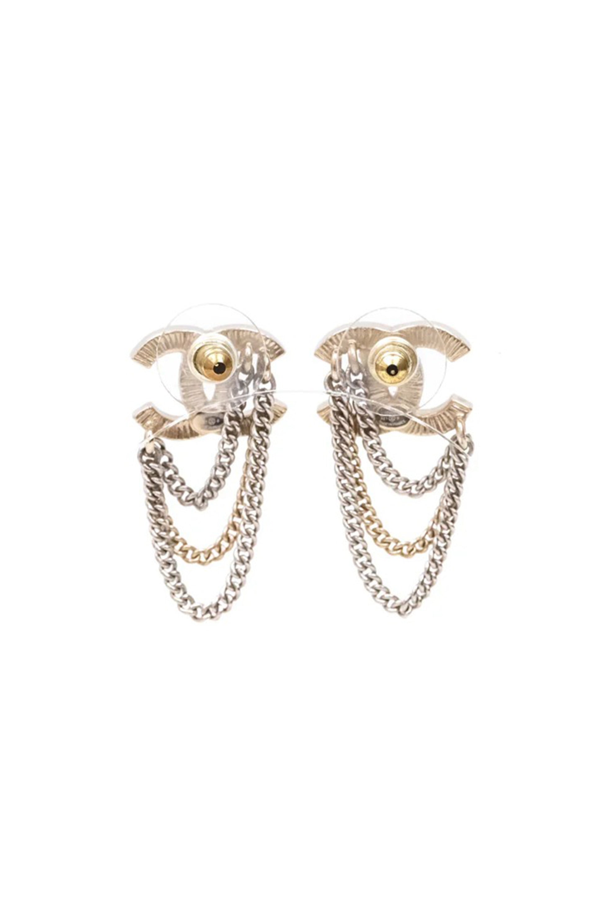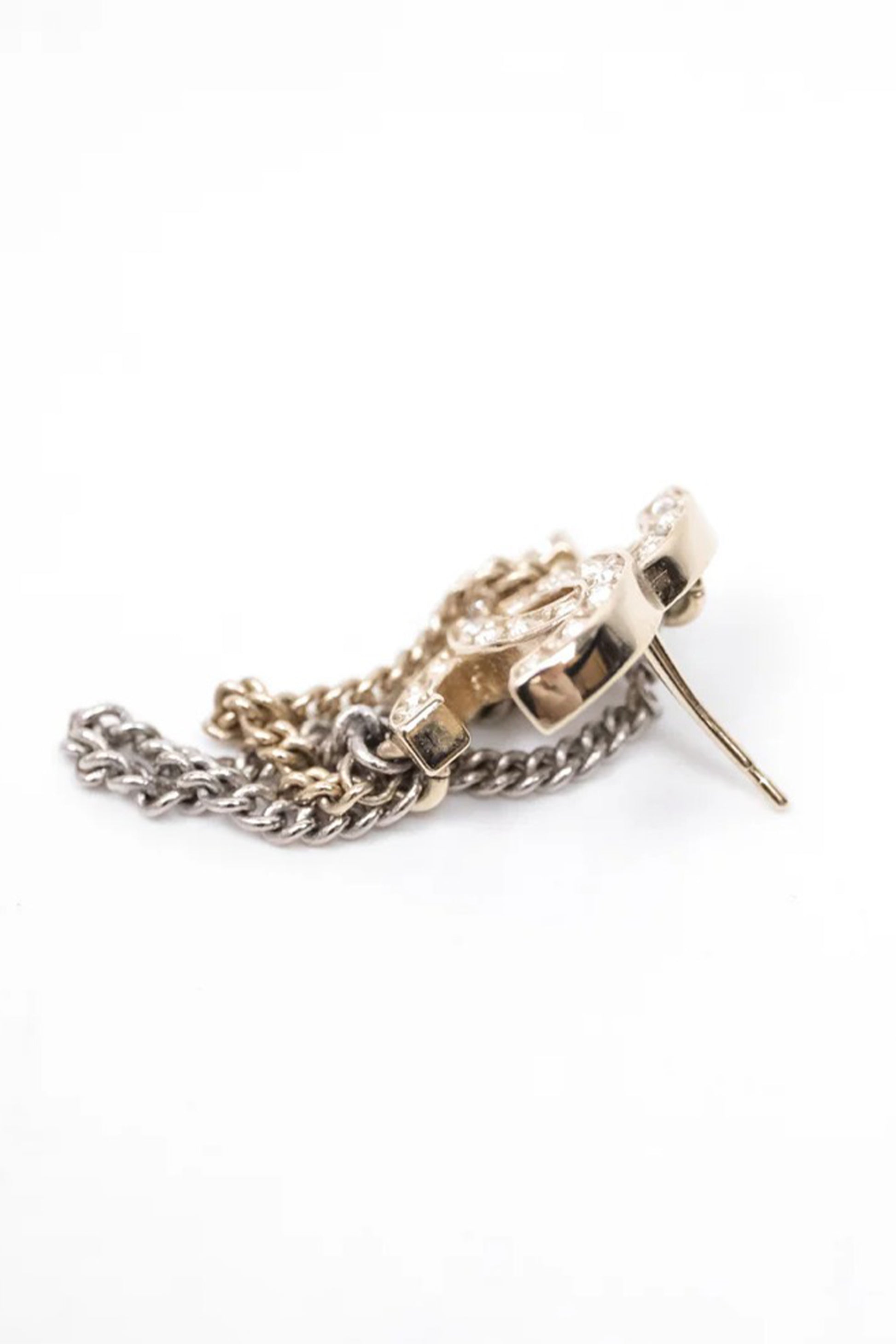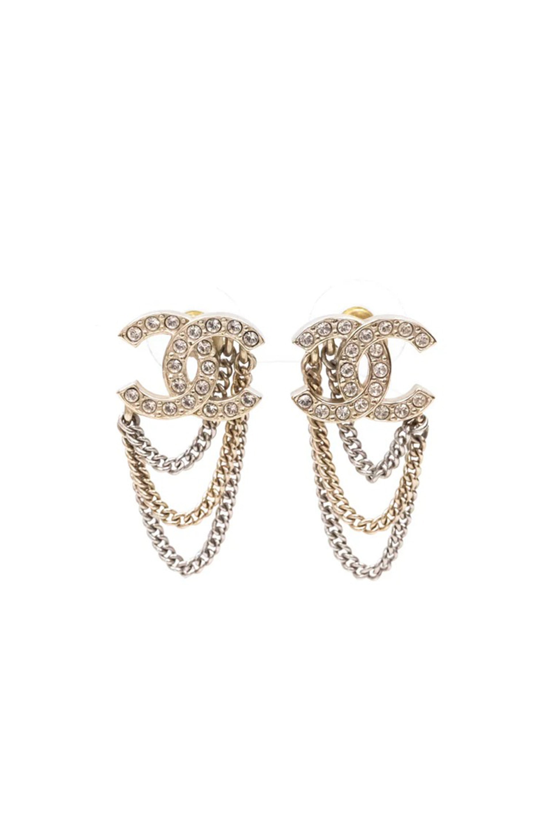 El diseño parte del emblemático logo CC entrelazado, elaborado en metal tono dorado y pavimentado con cristales transparentes que aportan brillo sutil y sofisticado. Desde la base cuelgan cadenas metálicas de doble tono (dorado y plateado), creando un efecto de movimiento elegante y una profundidad visual que eleva la pieza más allá del clásico pendiente de logo.