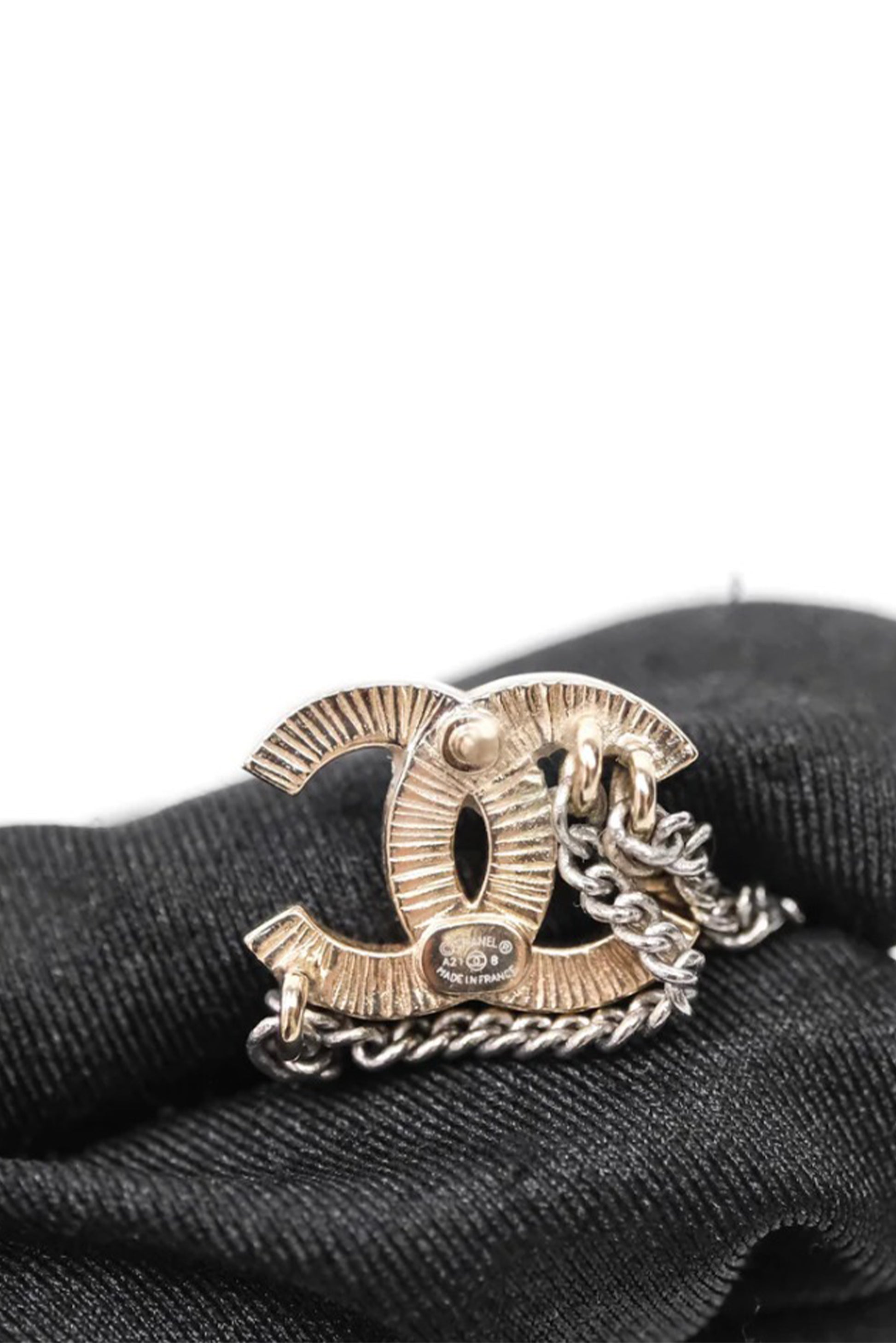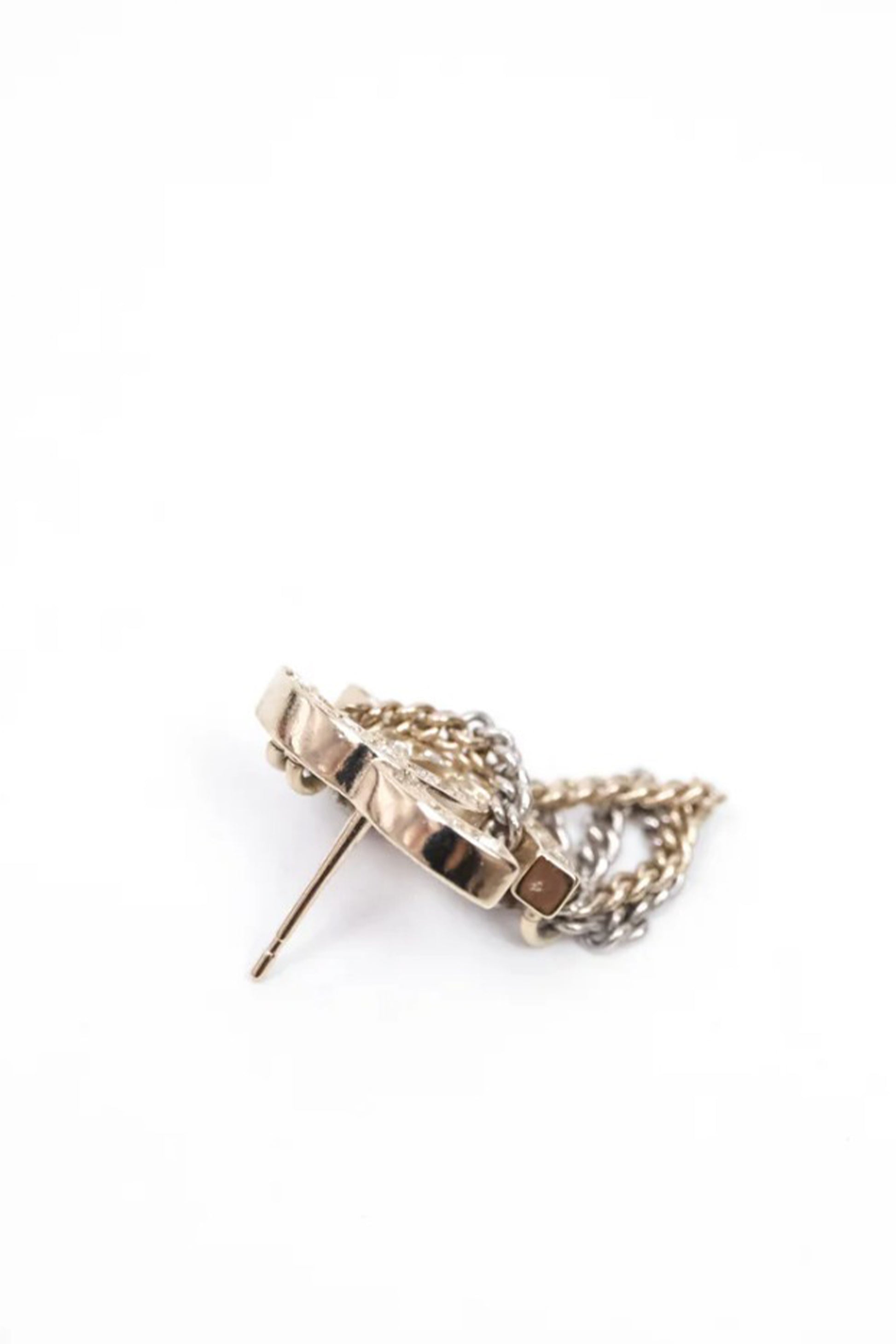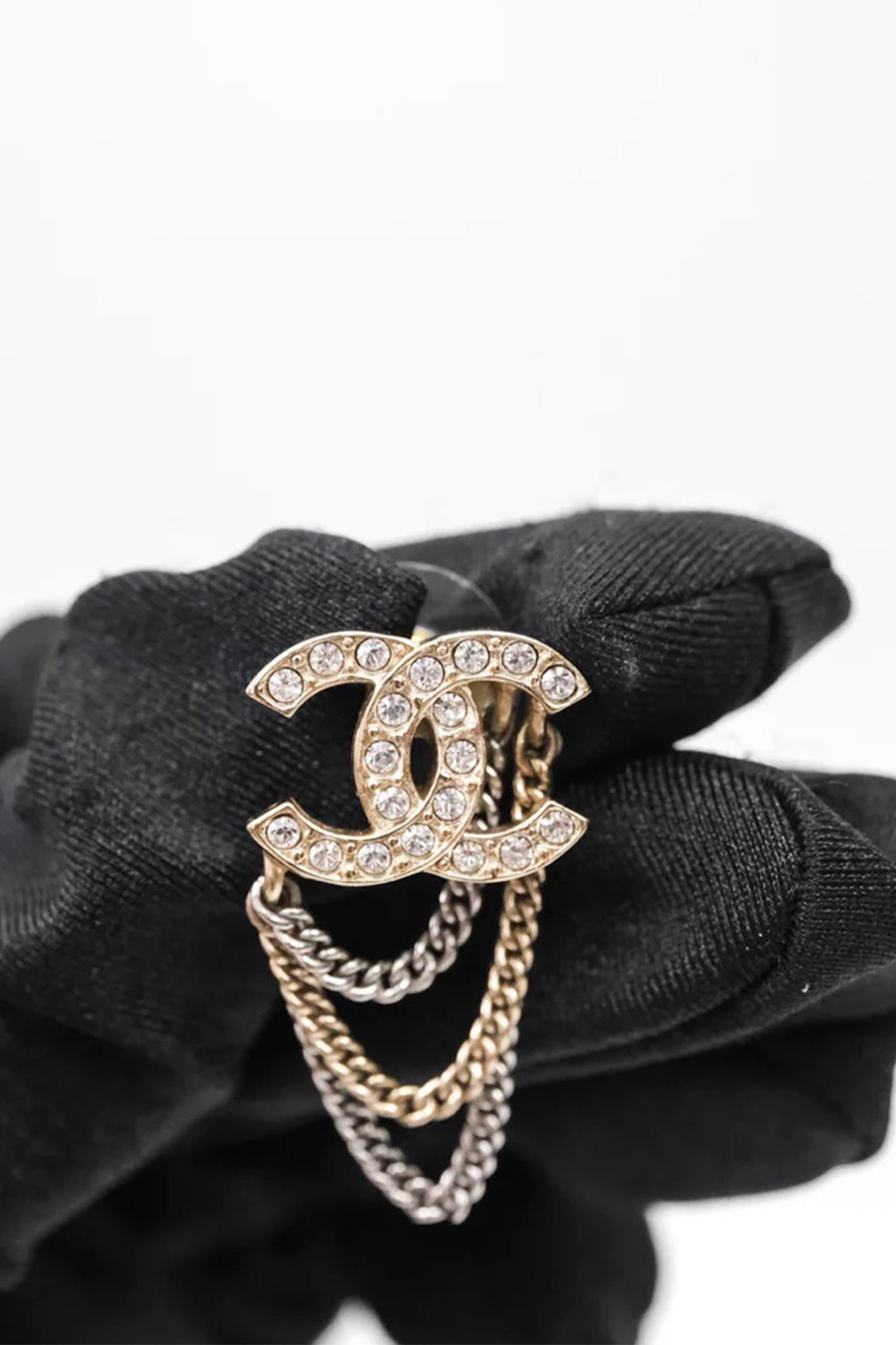 El diseño parte del emblemático logo CC entrelazado, elaborado en metal tono dorado y pavimentado con cristales transparentes que aportan brillo sutil y sofisticado. Desde la base cuelgan cadenas metálicas de doble tono (dorado y plateado), creando un efecto de movimiento elegante y una profundidad visual que eleva la pieza más allá del clásico pendiente de logo.