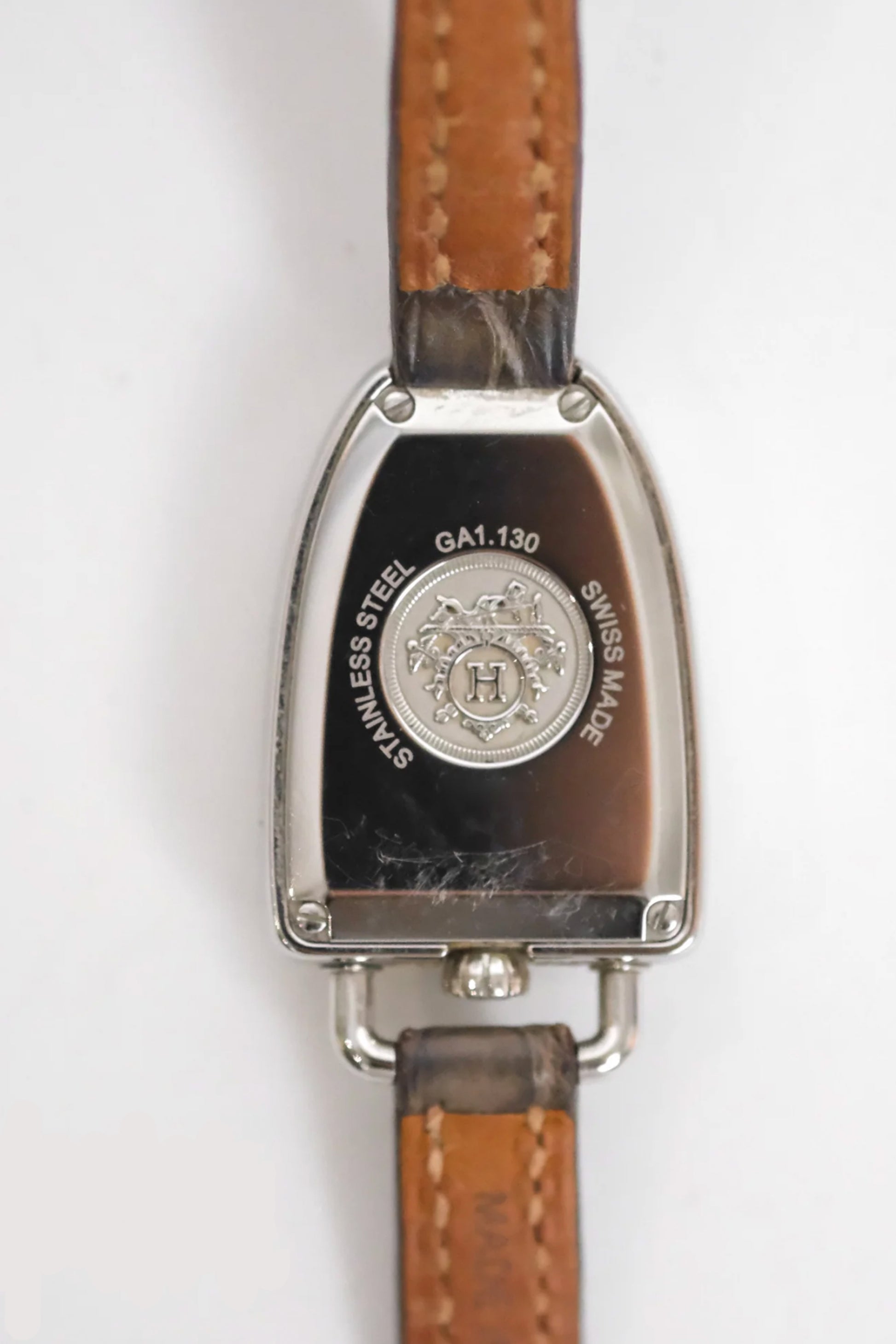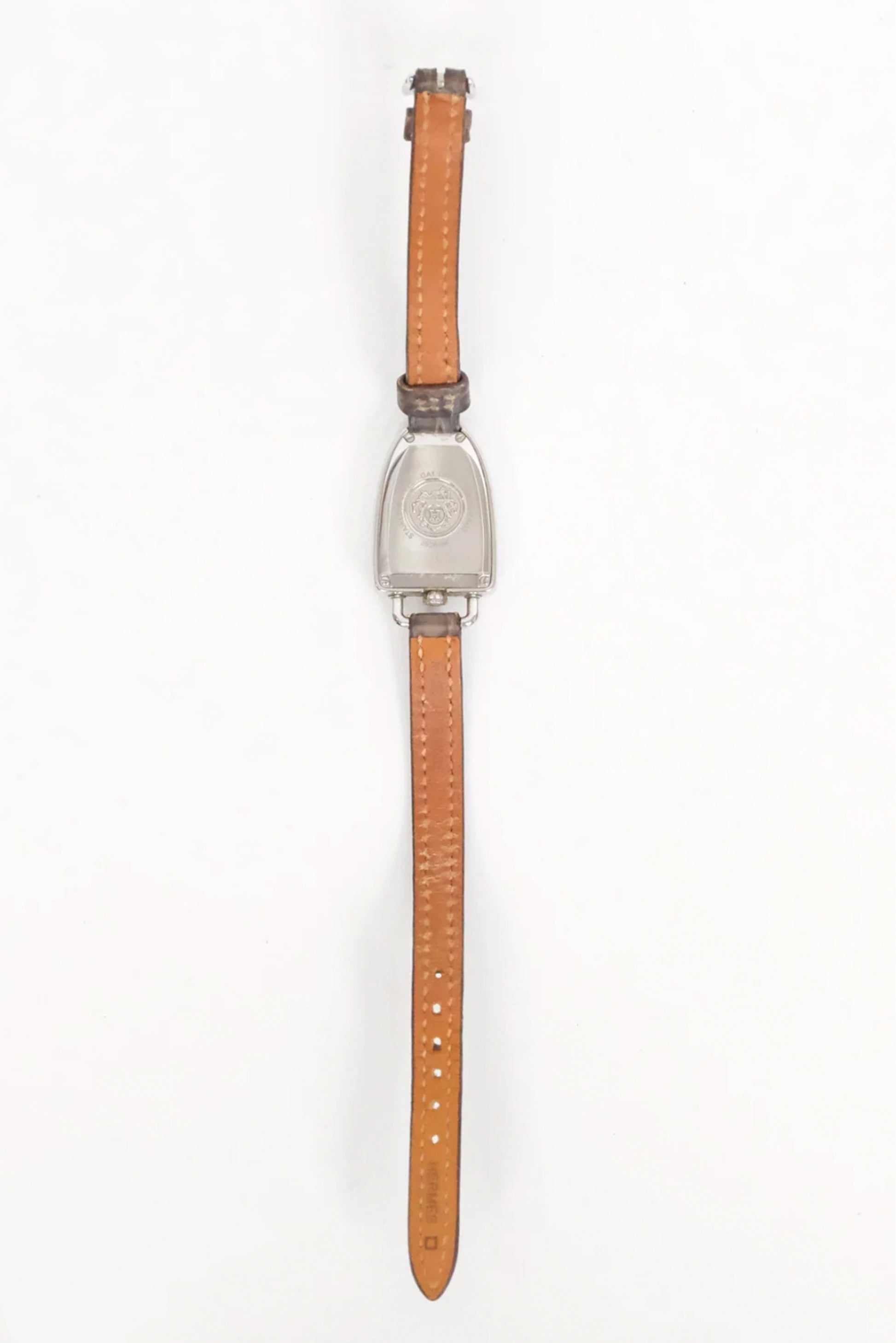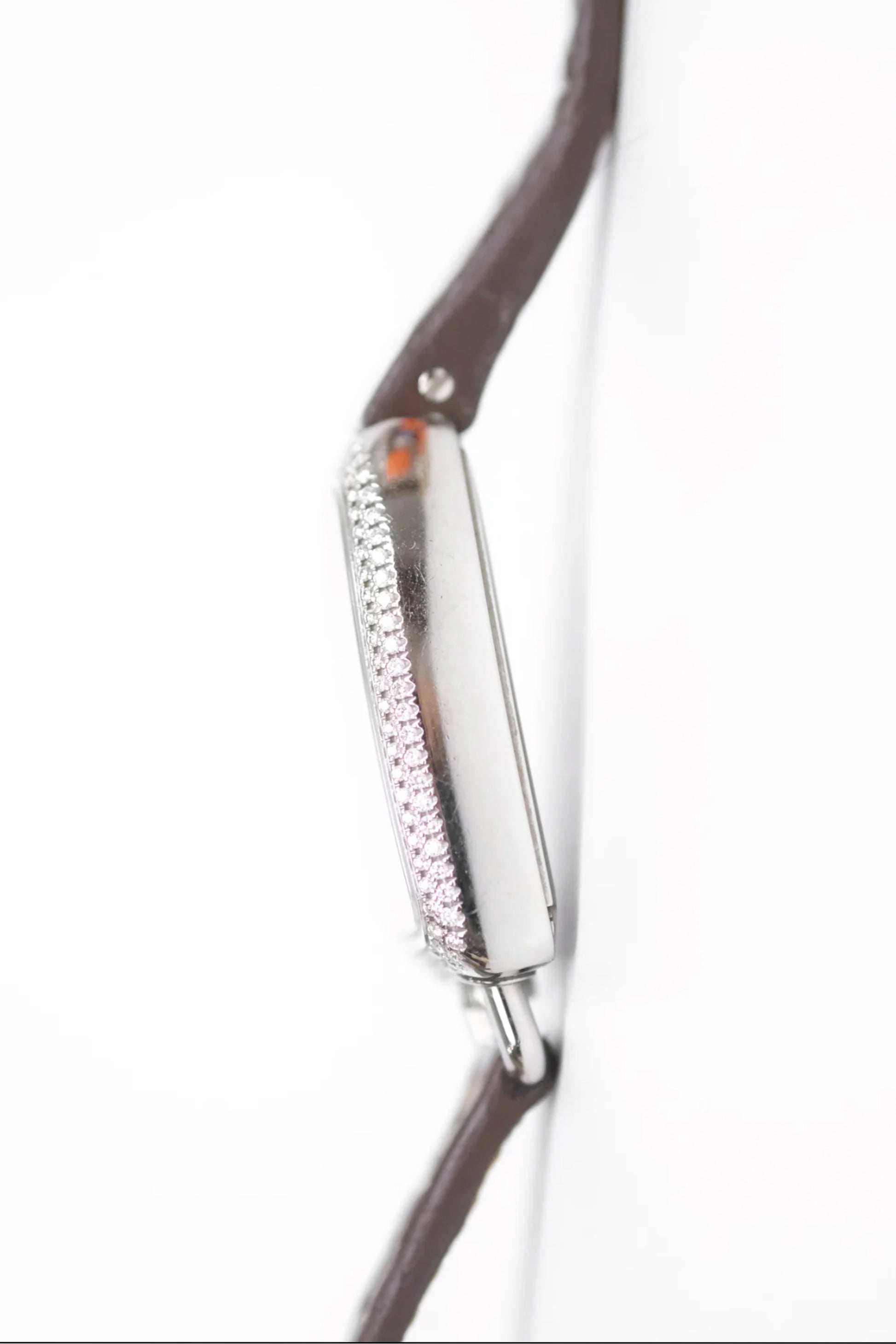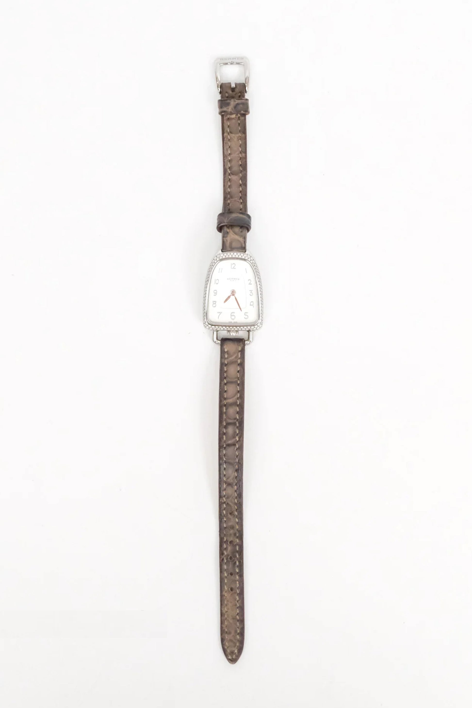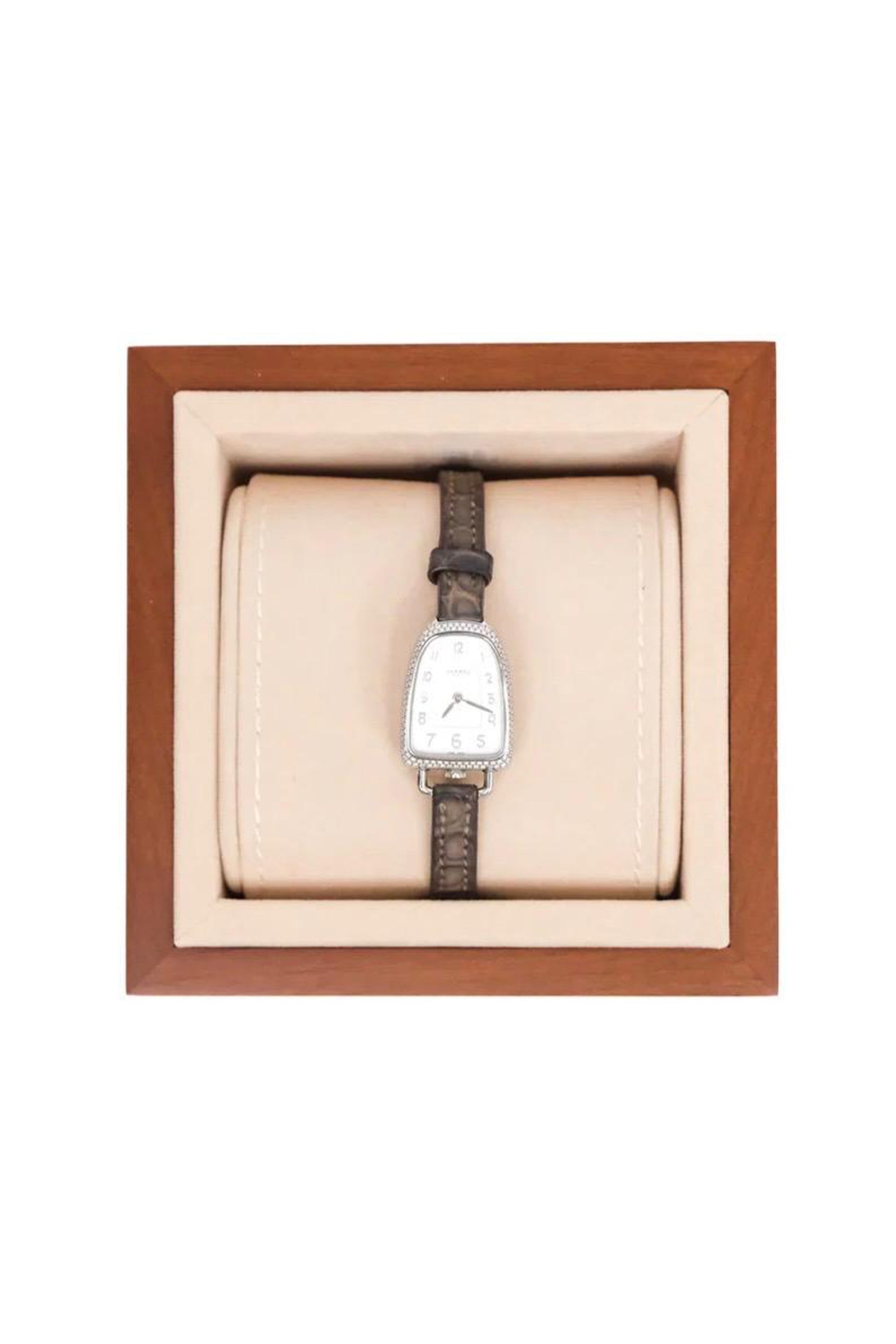 Este ejemplar presenta una caja de acero inoxidable de 32 mm con un refinado bisel engastado con diamantes, que aporta luminosidad y un toque de sofisticación sin perder la estética minimalista característica de Hermès. Su esfera plateada con numerales árabes estilizados ofrece una lectura clara y elegante, mientras que el diseño asimétrico de la caja añade un carácter distintivo y reconocible.