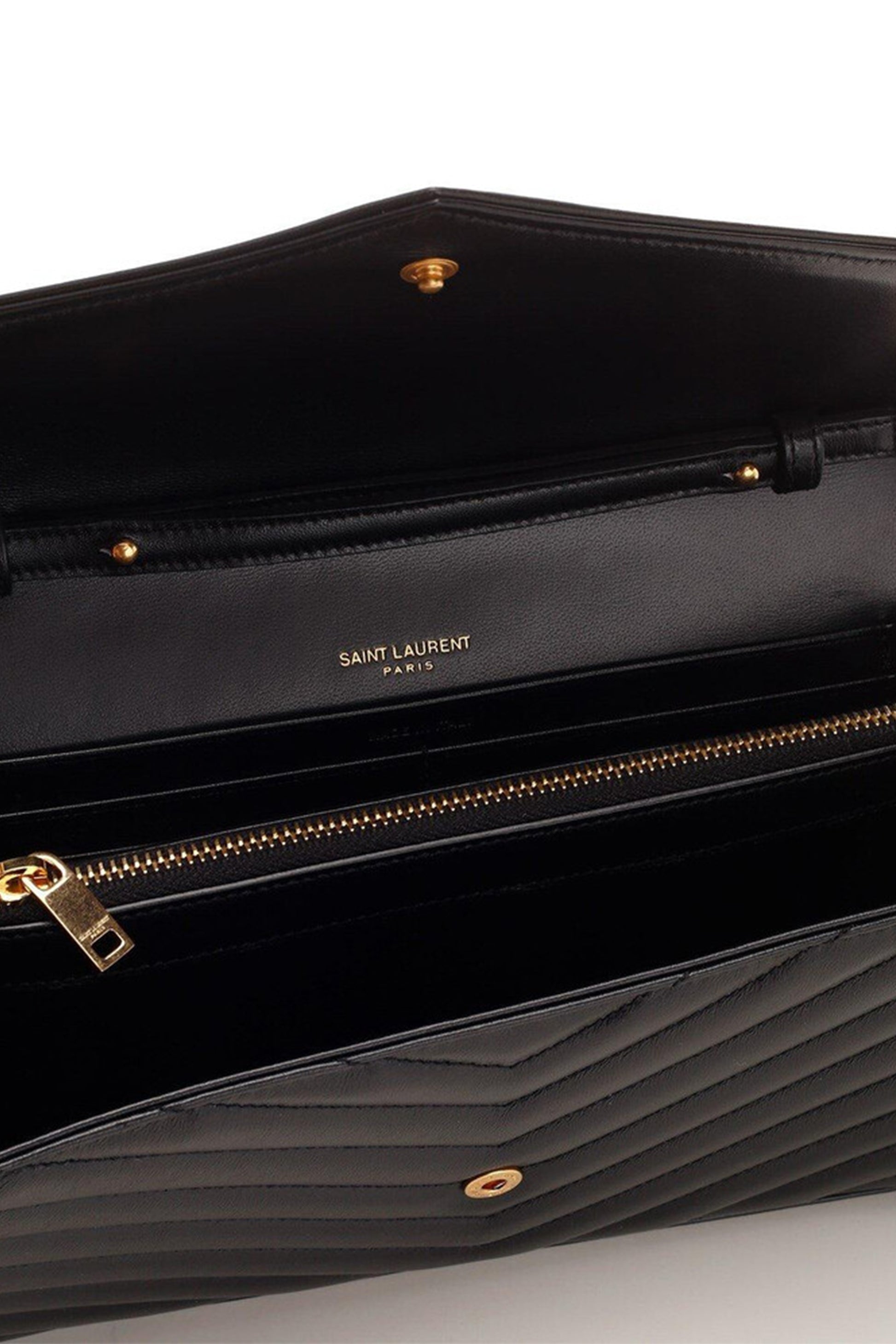 Este chain wallet de Saint Laurent está confeccionado en piel de becerro negra con el característico acolchado matelassé en patrón chevron (V), una firma visual de la línea Cassandre. En el centro destaca el emblemático monograma YSL en metal dorado, que aporta contraste, sofisticación y estatus inmediato.