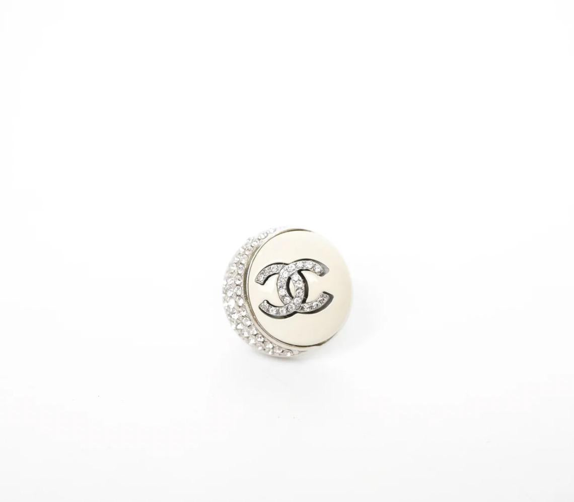 Aretes Chanel redondos tipo botón en tono plateado, con el icónico logo CC adornado con cristales blancos. Colección: 22C.