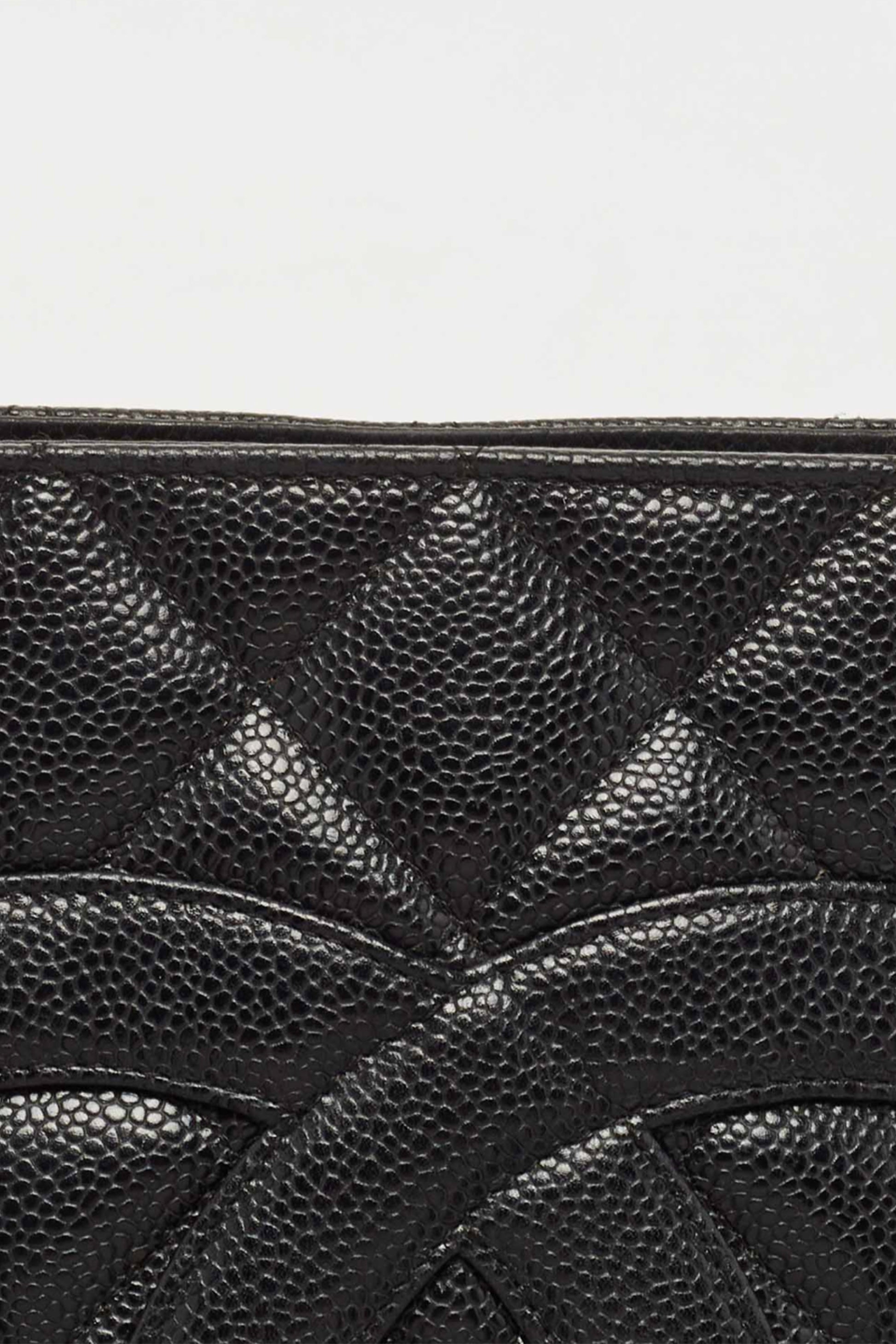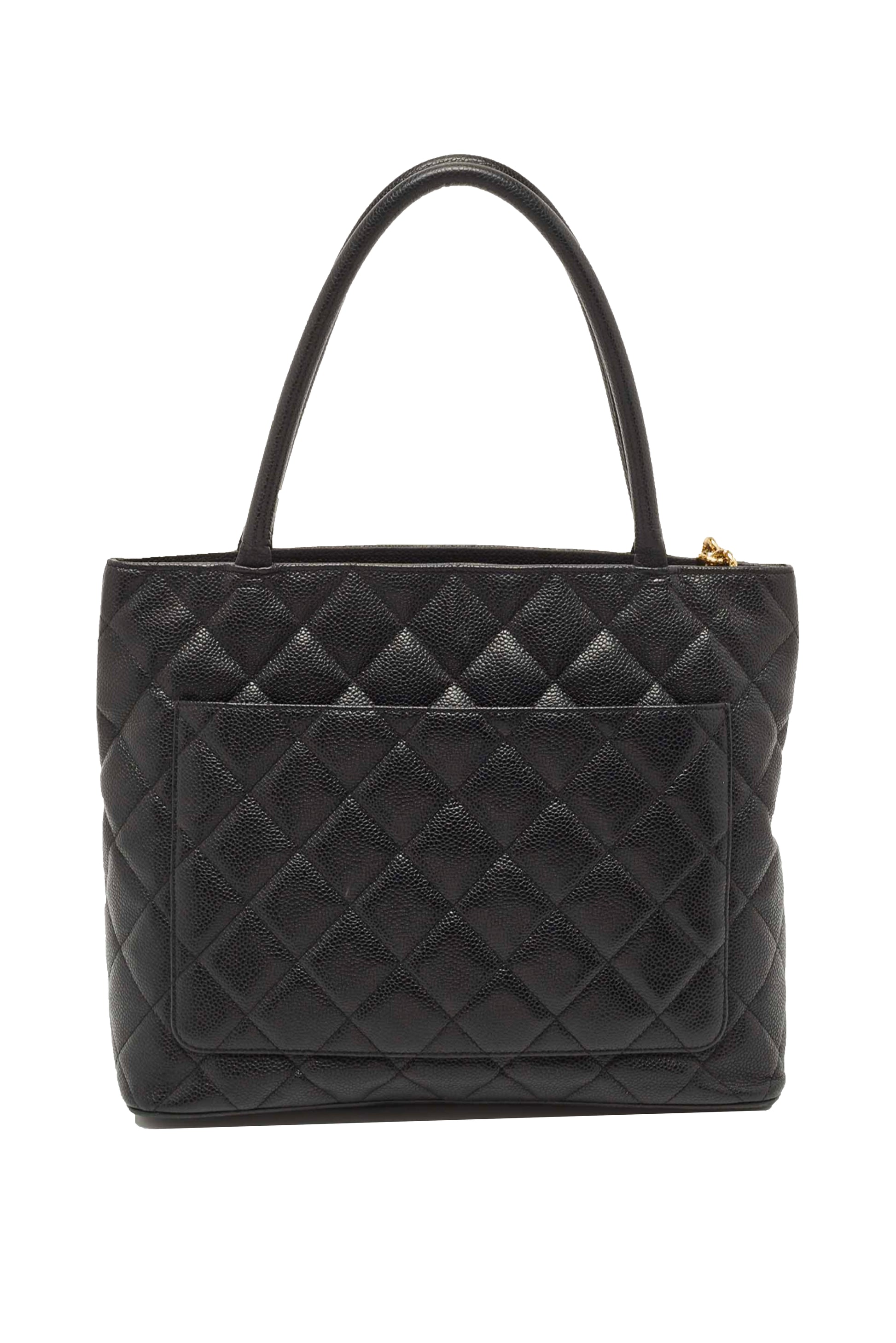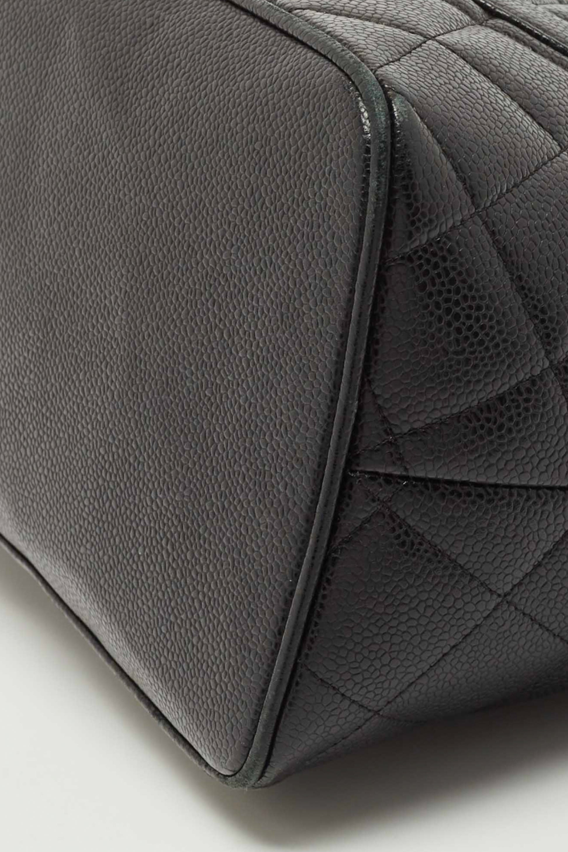 Confeccionado en piel caviar negra acolchada, famosa por su resistencia y durabilidad, el bolso presenta el característico patrón diamond quilting de la casa. Su silueta estructurada tipo tote se complementa con asas largas de hombro, permitiendo llevarlo cómodamente durante todo el día.